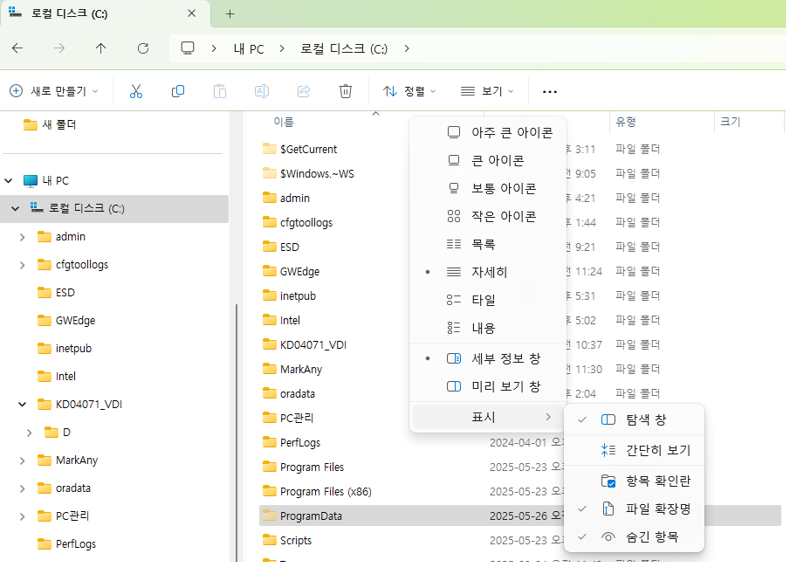 여기서 문제는 C:\ProgramData 폴더가 숨김으로 되어있는 경우가 있다.