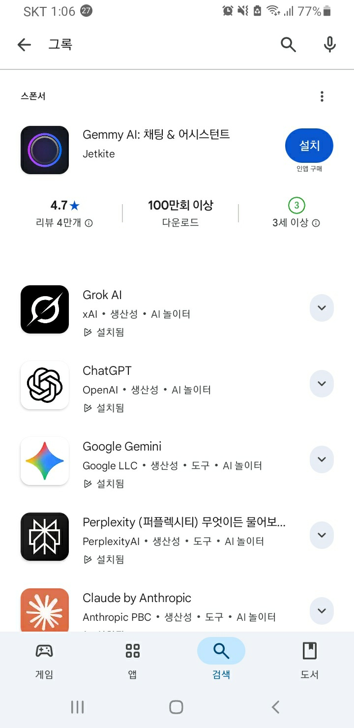 - 모바일에서 Play스토어 제미나이 chatgpt 그록 으로 검색 후 설치