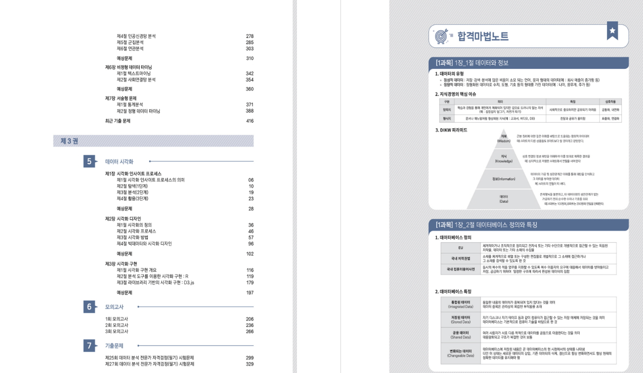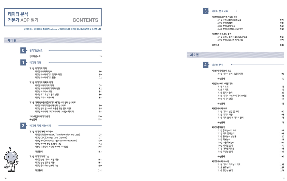 ADP 필기시험 대비 교재 중 가장 많이 활용되는 **『ADP 필기 데이터 분석 전문가 : 올패키지』(윤종식 저)**의 목차를 정리해드릴게요. 이 책은 5개 과목을 체계적으로 다루며, 각 장마다 예상문제와 기출문제를 포함하고 있어 실전 대비에 효과적입니다.