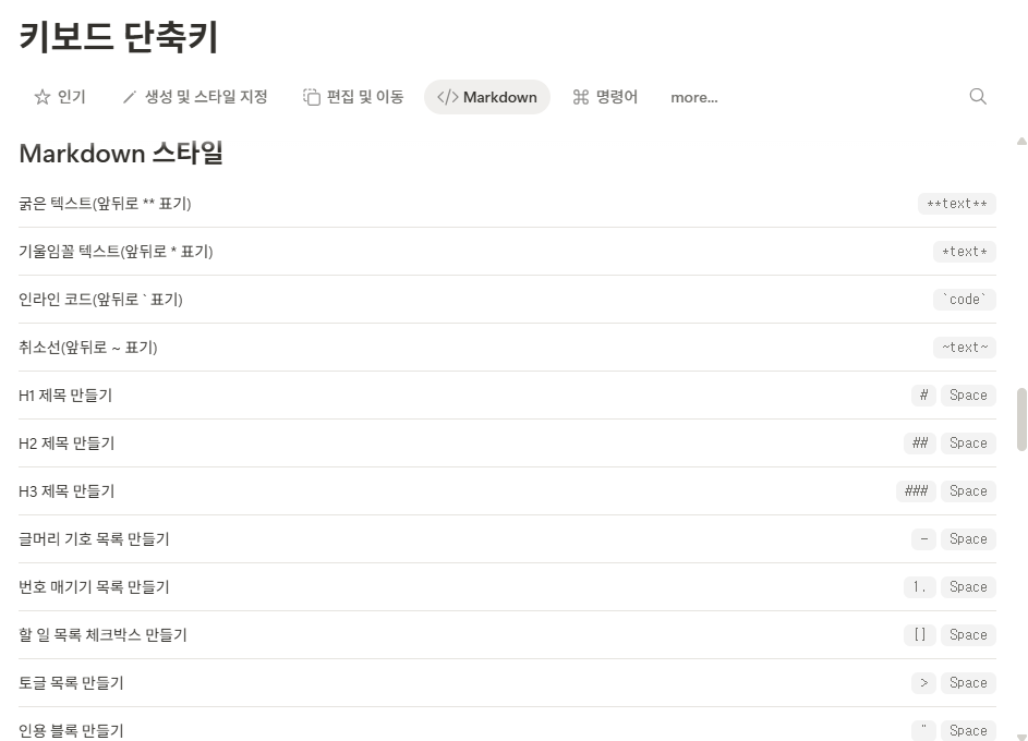 Windows 단축키 모음창 열기 : Ctrl + Alt + /![]() 👉🏻 취소선 : Ctrl + S(X) 👉🏻코드로 표시 : Ctrl + E 👉🏻대제목 : #space # 입력 space 누르면 제목1 이라고 표시됨 여기에다 대제목 이라고 씀 👉🏻중제목 : ##space 👉🏻소제목 : ###space 👉🏻토글 : >space > 입력 space 누르면 첫줄에 역삼각형 아이콘과 토글제목, 두번째 줄에 토글 내용 입력 👉🏻구분선 : - - -space 👉🏻말머리 : -space 👉🏻체크박스 : []space ![]() ![]() 많이 쓰는 단축키