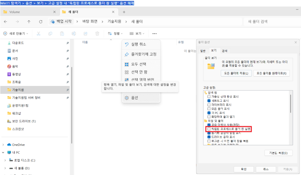 Win11 탐색기 > 옵션 > 보기 > 고급 설정 내 "독립된 프로세스로 폴더 창 실행" 옵션 해제 |