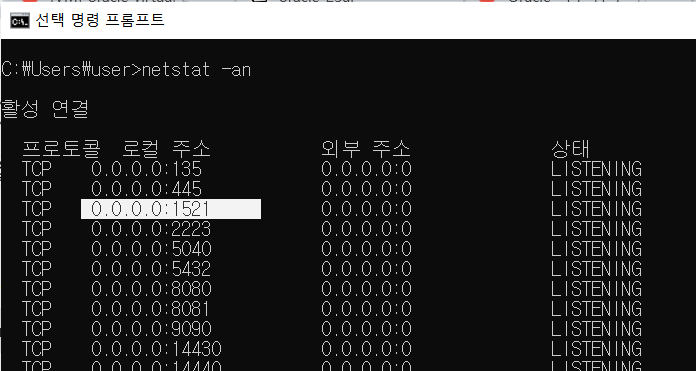그리고 다시 netstat -ntl로 확인해서 0.0.0.0:1521 또는 <VM의 IP>:1521 으로 바뀌었는지 확인하세요. |
