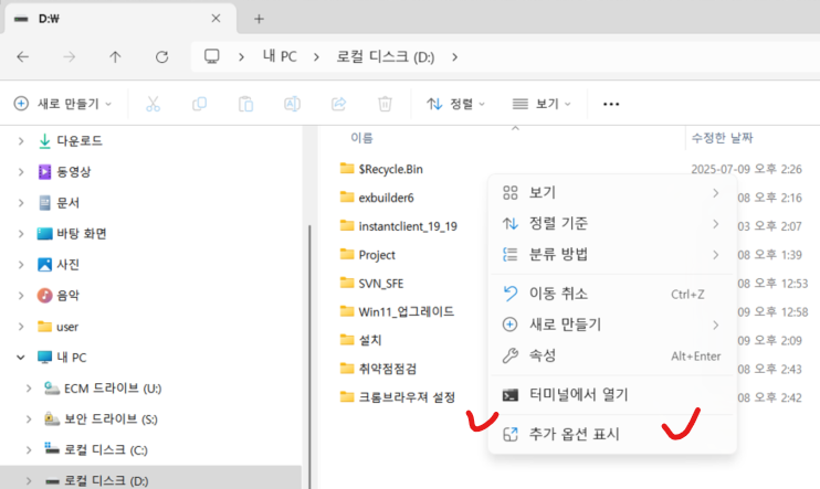 ![]() 추가 옵션 표시 클릭 해야 "새 폴더" 등 보입니다. |