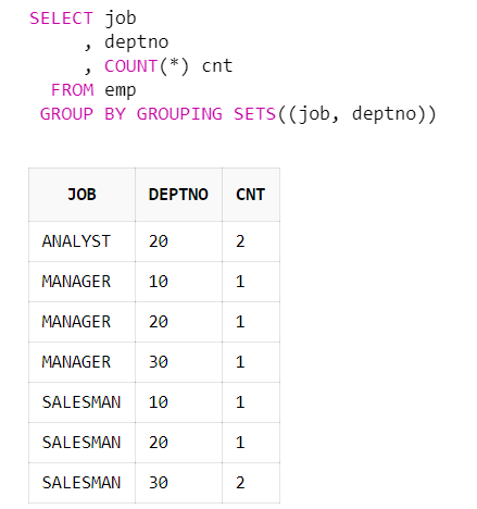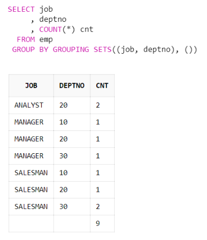 | SELECT job , deptno , COUNT(*) cnt FROM emp GROUP BY GROUPING SETS((job, mgr), (job, deptno), ()) |