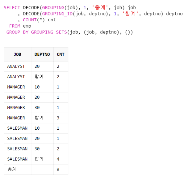 - SELECT ... GROUP BY job UNION ALL SELECT ... GROUP BY deptno 와 동일