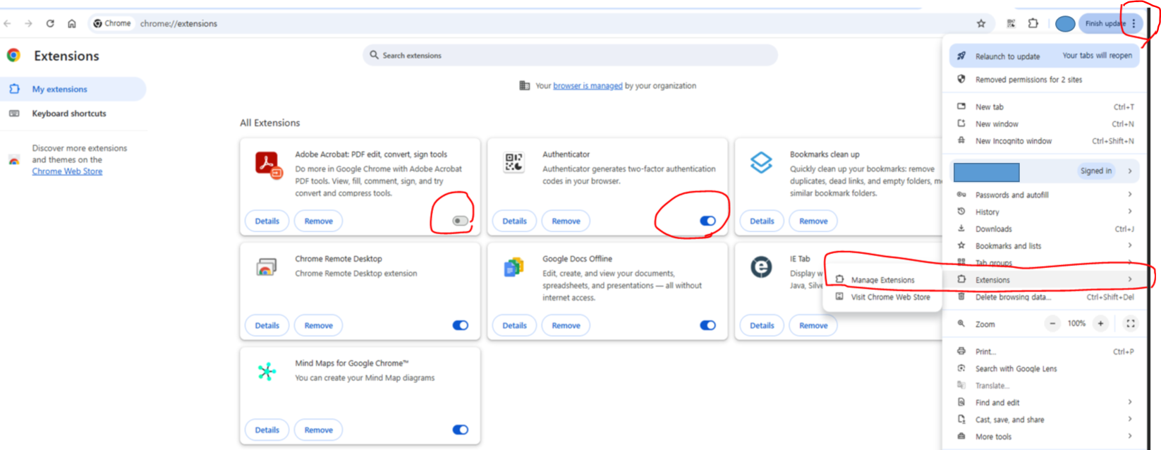 - 오른쪽 상단에서 더보기 확장 프로그램 확장 프로그램 관리를 선택합니다. Extenstions - Manage Extensions